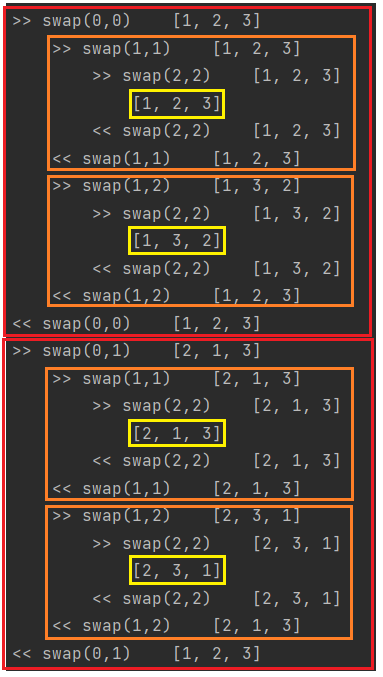 => 2에서 만들 수 있는 것 모두 나왔으므로, 1과 3를 swap하여 다시 밑으로 내려가기 시작