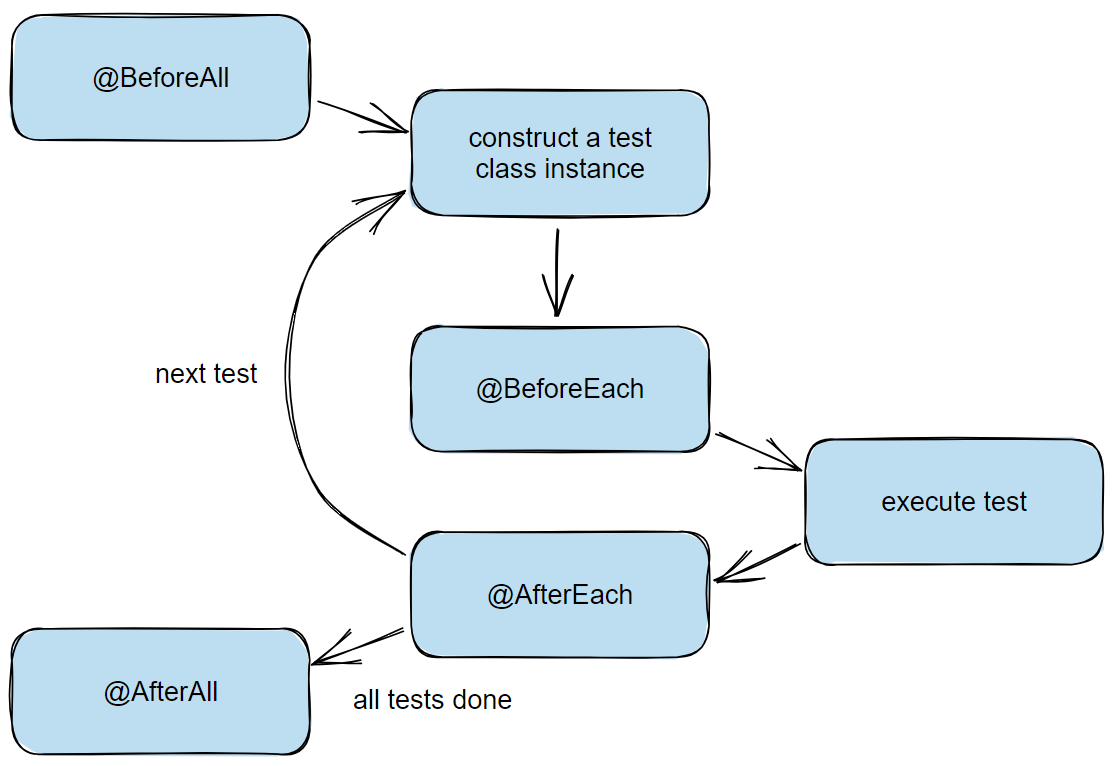 - @BeforeAll : 테스트를 시작하기 전에 호출되는 메서드를 정의