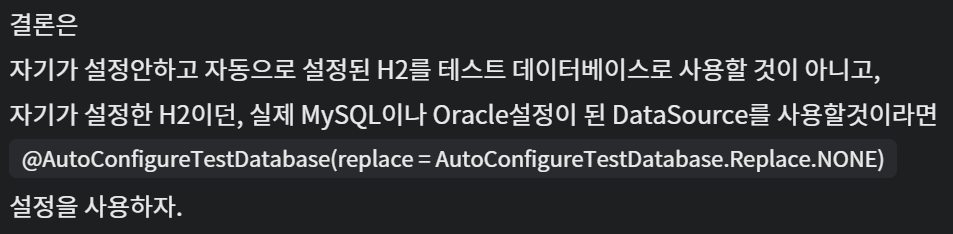 @AutoConfigureTestDatabas(replace = Replace.NONE) 어노테이션을 추가로 붙이면 됨