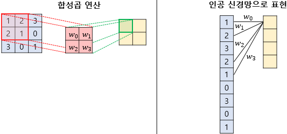 앞에서 배운 합성곱 연산을 인공 신경망의 관점으로 표현하면 아래와 같다.