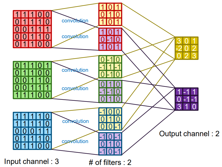 따라서 입력 이미지가 3개의 채널을 가질 경우, 커널의 채널도 3개여야 한다.