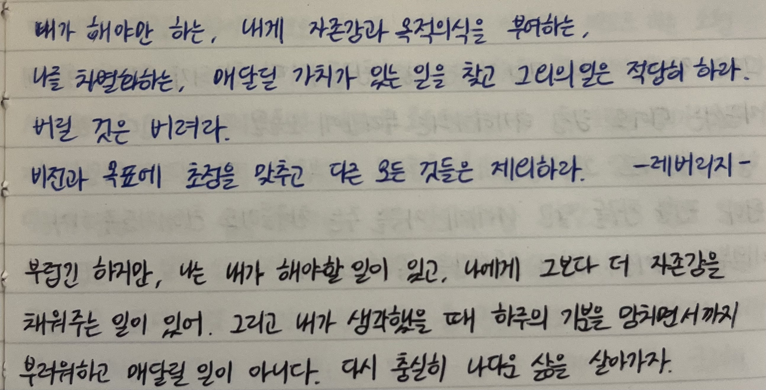 각자에게 맞는 방법이 있는 거니까.. 나만의 속도로나마 루틴을 만들어갈 수 있으면 좋겠다.
