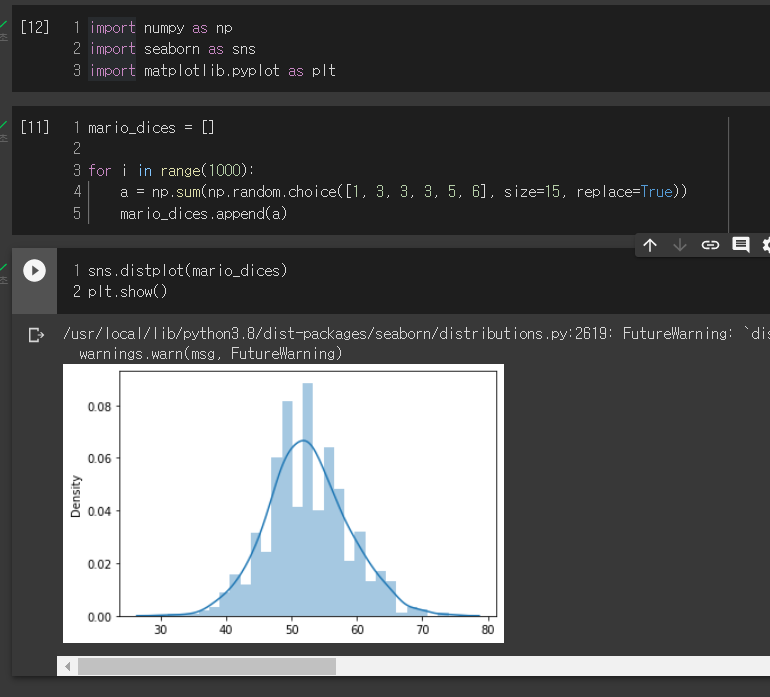 step2 : 실제로 마리오 주사위를 15번 던지는 시행을 n번정도 해본다.